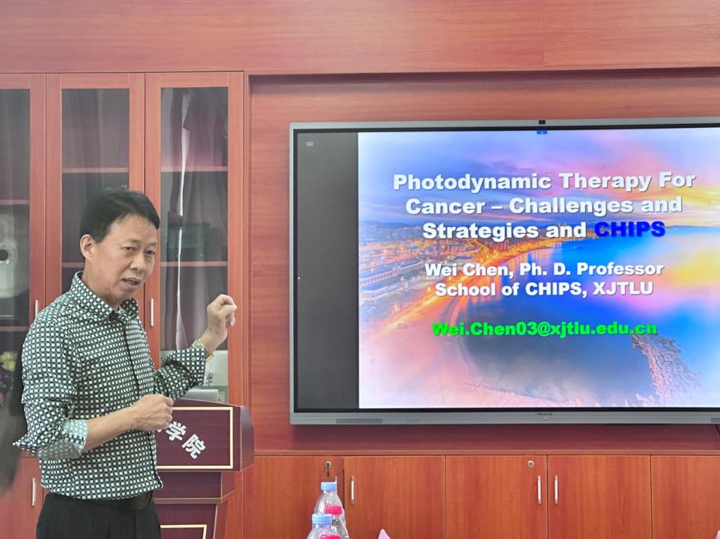 随后,陈伟教授作了题为“光动力新一代光敏材料的研发—机遇与挑战”的专题学术报告。陈伟教授从光动力疗法的新进展、协同疗法抗肿瘤策略的提出与完善、新型光敏材料—铜半胱胺治疗深部癌的概念、纳米光敏材料助力植物增产的应用展望等几方面介绍了自己在癌症治疗纳米医学领域和纳米技术领域的研究成果。此外,陈伟教授还介绍了西交利物浦大学芯片学院,分享了自己将芯片、AI结合应用到医学健康领域的构想。在交流互动环节,陈伟教授与在座师生就纳米光敏材料合成产量、芯片续航性、光敏材料应用于生物传感的进展等多个问题进行了详细解答,并对相关领域的发展作出展望。座谈会后,陈伟教授还与师生分享了自己对于哲学的见解和喜爱的人文哲学书籍,勉励学生要善于发现问题并勇于提问和表达自己的看法。